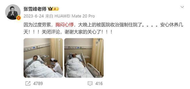2023年6月,张雪峰在社交账号发文透露,他因为过度劳累,胸闷心悸,被强制住院了。