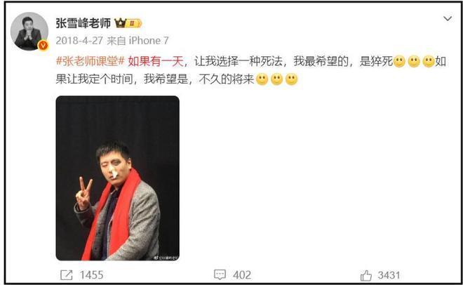 甚至网友扒出在2018年,张雪峰就说过猝死的话题,彼时他在社交账号发文说如果让他选一种死法,他希望是猝死。如果要定一个时间,希望是不久的将来。