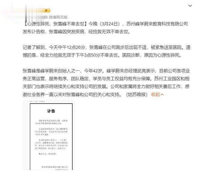 公司发布了有关张雪峰的讣告,从讣告中可知,张雪峰是心源性猝死,于2026年3月24日下午3时50分离世。